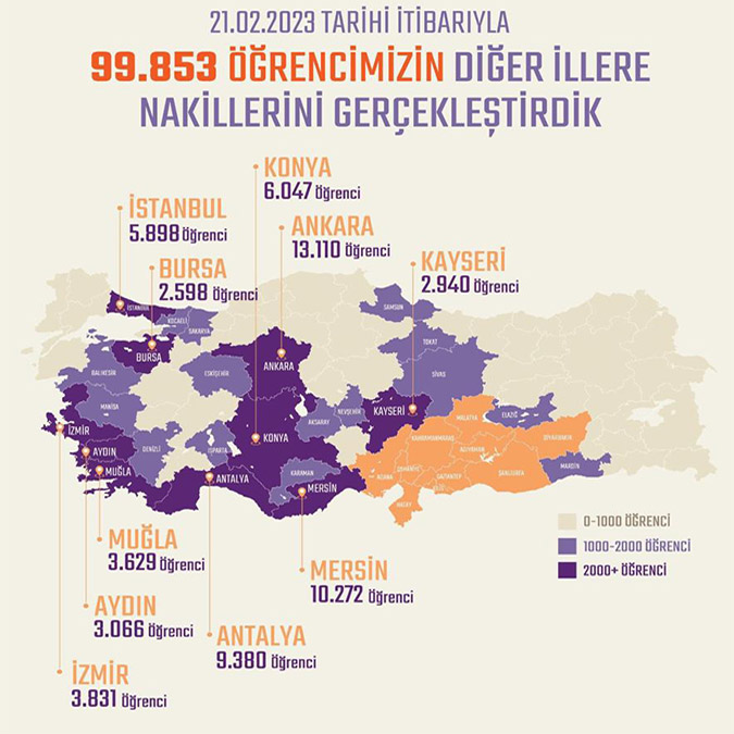 Bakan Özer, 13 bin 110 öğrencinin Ankara, 10 bin 272 öğrencinin Mersin, 9 bin 380 öğrencinin Antalya, 6 bin 47 öğrencinin Konya, 5 bin 898 öğrencinin İstanbul, 3 bin 831 öğrencinin İzmir, 3 bin 629 öğrencinin Muğla, 3 bin 66 öğrencinin Aydın, 2 bin 940 öğrencinin Kayseri ve 2 bin 598 öğrencinin Bursa’ya naklinin alındığını açıkladı.