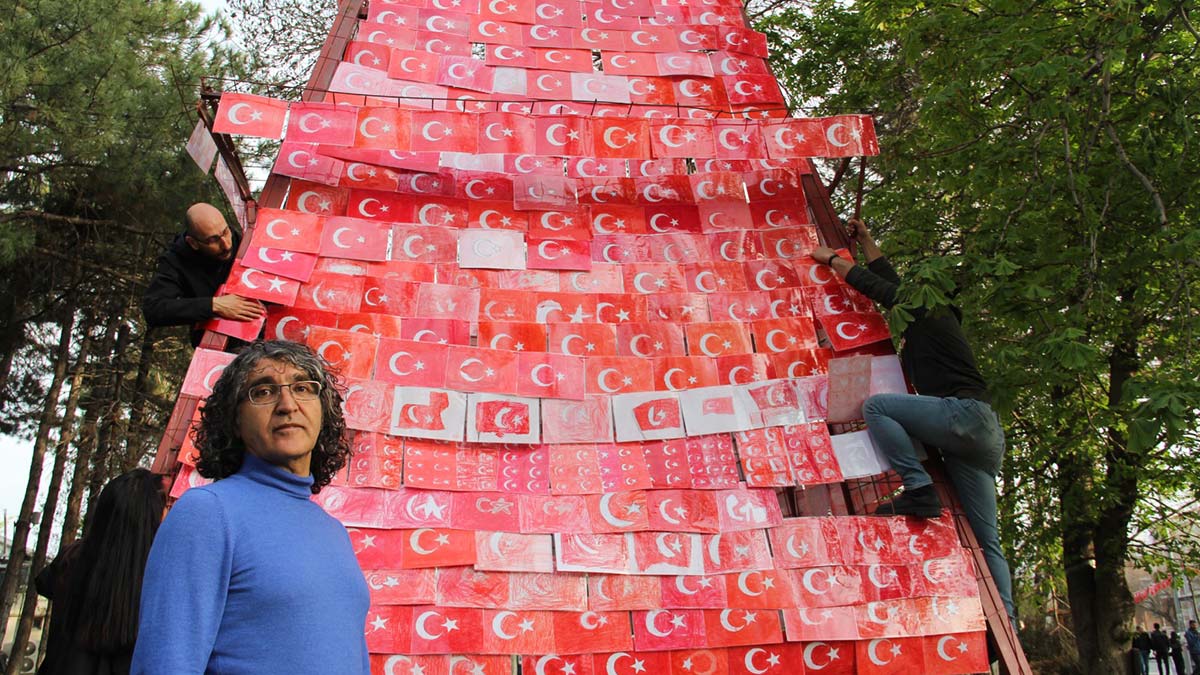 Türk bayrağını anıtsal bir nitelik olarak piramit şeklindeki konstrüksiyona yerleştirdiğini belirten Kavukcu, “Çocukların kendi özgün dili ile çizmiş oldukları bayrakların dili olarak bir anıt eser ortaya çıktı. Anıtsal bir etki oluşturmaya çalıştık.
