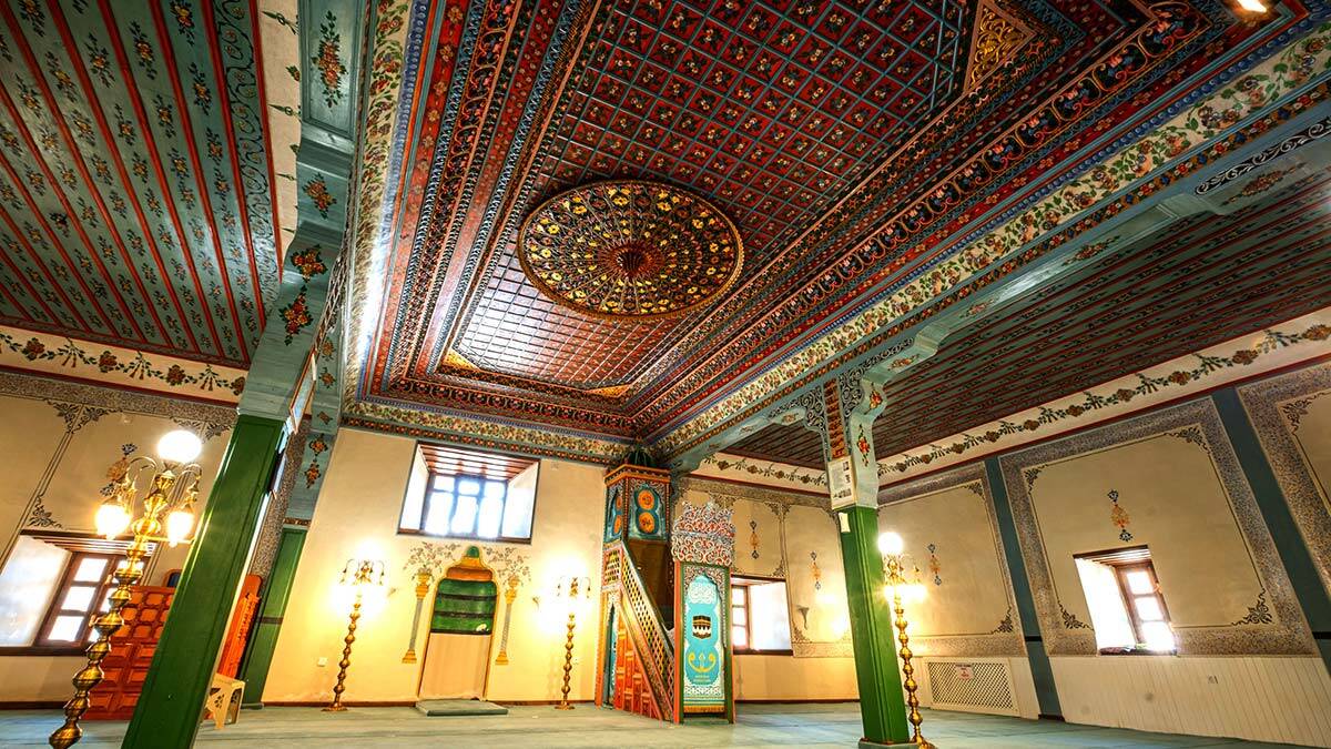 Sivas’ın Altınyayla ilçesindeki 126 yıllık Altınyayla Camisi duvar işlemeleri ve ahşap tavan motifleri ile ilgi çekiyor