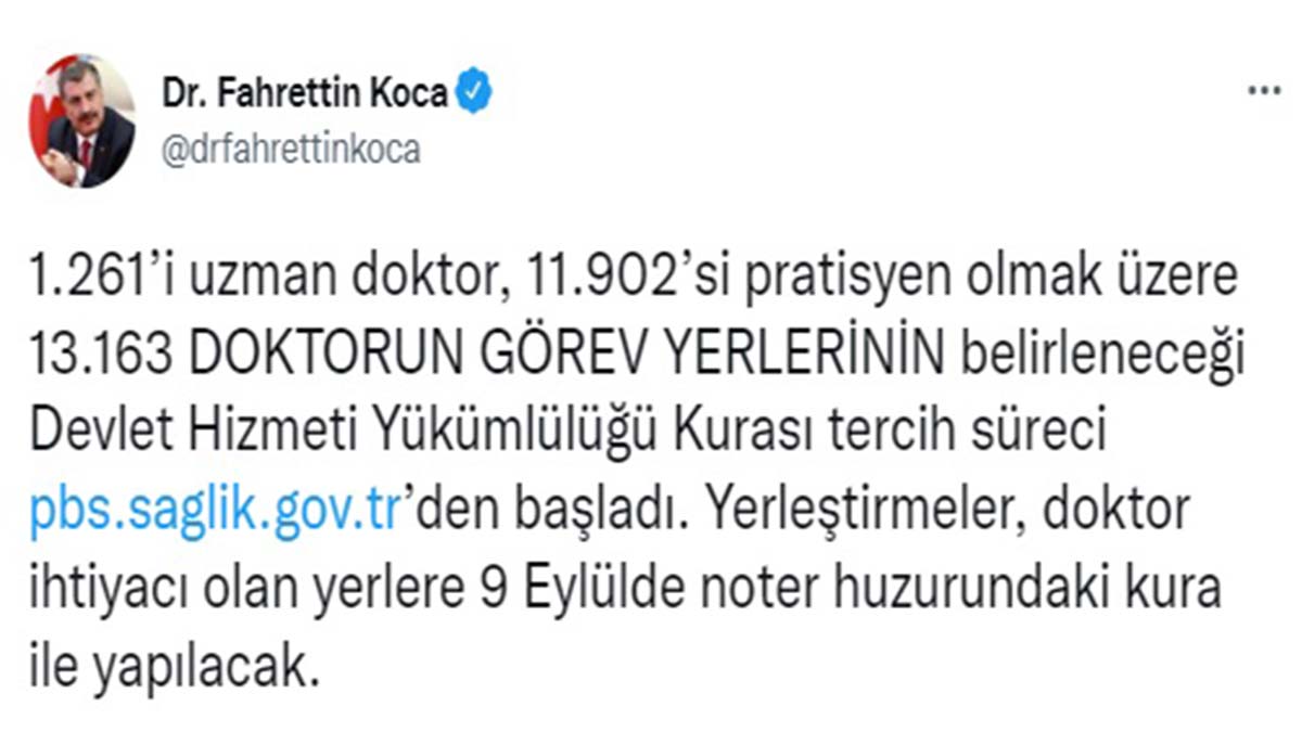 Bakan Koca, Twitter hesabından yaptığı açıklamada, “1261’i uzman doktor, 11 bin 902’si pratisyen olmak üzere 13 bin 163 doktorun görev yerlerinin belirleneceği Devlet Hizmeti Yükümlülüğü Kurası tercih süreci http://pbs.saglik.gov.tr’den başladı. Yerleştirmeler, doktor ihtiyacı olan yerlere 9 Eylül’de noter huzurundaki kura ile yapılacak” dedi.