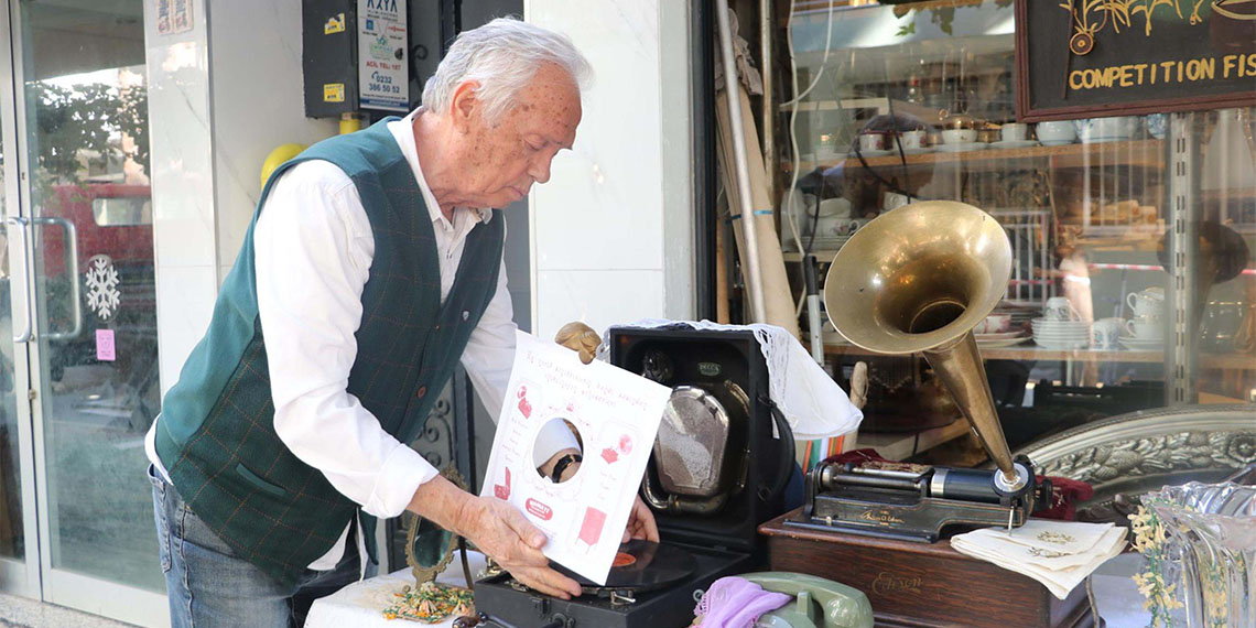 İzmir’in Alsancak semtinde antikacılık yapan Bülent Hitay, 147 yıllık gramofondan 120 yıllık tabloya kadar birçok antika eşyayı dükkanında satışa sunuyor.