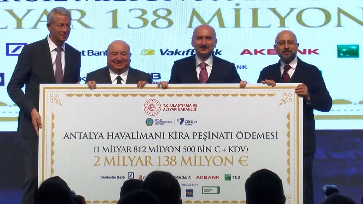 Antalya Havalimanı Projesi, Kamu-Özel İşbirliği İhalesi Kira Peşinatı Ödeme Töreni, İstanbul’da düzenlendi. Törene Ulaştırma ve Altyapı Bakanı Adil Karaismailoğlu, ihaleye katılan Fraport AG CEO’su Dr. Stefan Schulte, TAV Havalimanları İcra Kurulu Başkanı Sani Şener ile Devlet Hava Meydanları Genel Müdürü ve Yönetim Kurulu Başkanı Hüseyin Keskin katıldı.