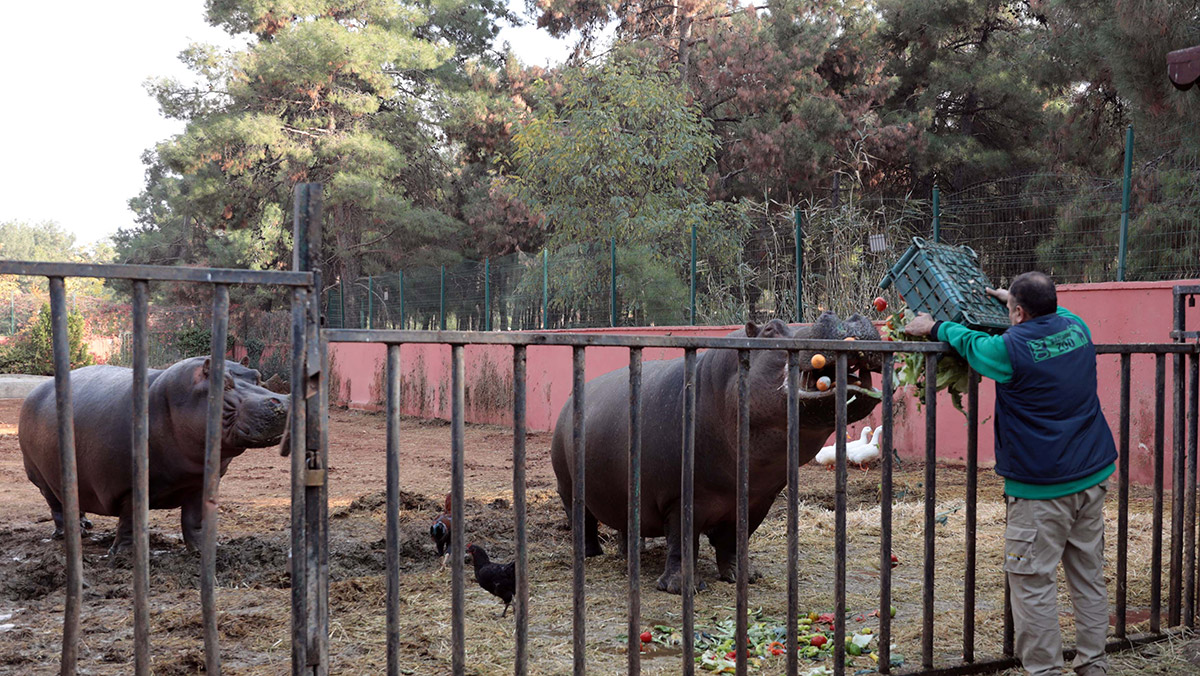 Gaziantep Hayvanat Bahçesi’nde 2 ton ağırlığındaki su aygırlarına özel kış menüsü hazırlandı. Kışlık kafeslerine alınan su aygırları, kurutulmuş incir, üzüm ve keçi boynuzu ile besleniyor.