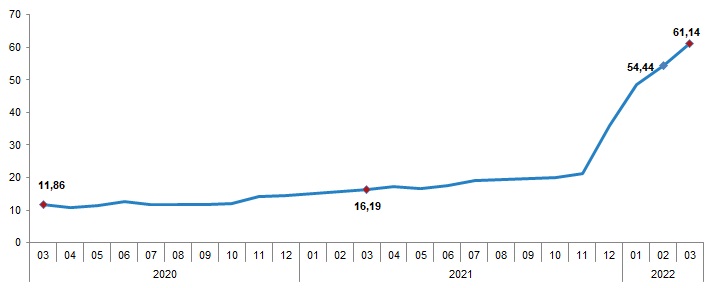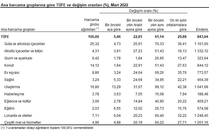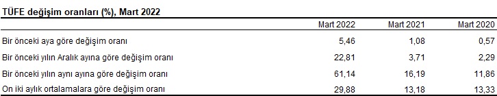 TÜFE’de (2003=100) 2022 yılı Mart ayında bir önceki aya göre %5,46, bir önceki yılın Aralık ayına göre %22,81, bir önceki yılın aynı ayına göre %61,14 ve on iki aylık ortalamalara göre %29,88 artış gerçekleşti.