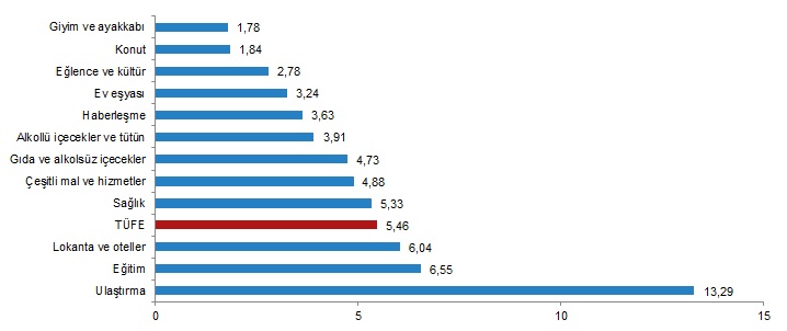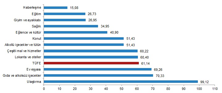 Yıllık en düşük artış %15,08 ile haberleşme ana grubunda gerçekleşti. Bir önceki yılın aynı ayına göre artışın düşük olduğu diğer ana gruplar sırasıyla %26,73 ile eğitim, %26,95 ile giyim ve ayakkabı ve %34,95 ile sağlık oldu. Buna karşılık, bir önceki yılın aynı ayına göre artışın yüksek olduğu ana gruplar ise sırasıyla, %99,12 ile ulaştırma, %70,33 ile gıda ve alkolsüz içecekler, %69,26 ile ev eşyası oldu.