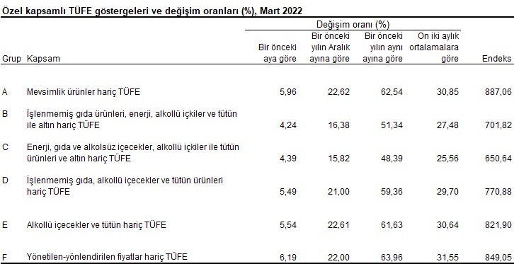 İşlenmemiş gıda ürünleri, enerji, alkollü içkiler ve tütün ile altın hariç TÜFE’de 2022 yılı Mart ayında bir önceki aya göre %4,24, bir önceki yılın Aralık ayına göre %16,38, bir önceki yılın aynı ayına göre %51,34 ve on iki aylık ortalamalara göre %27,48 artış gerçekleşti.