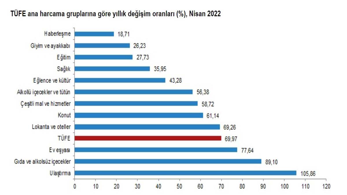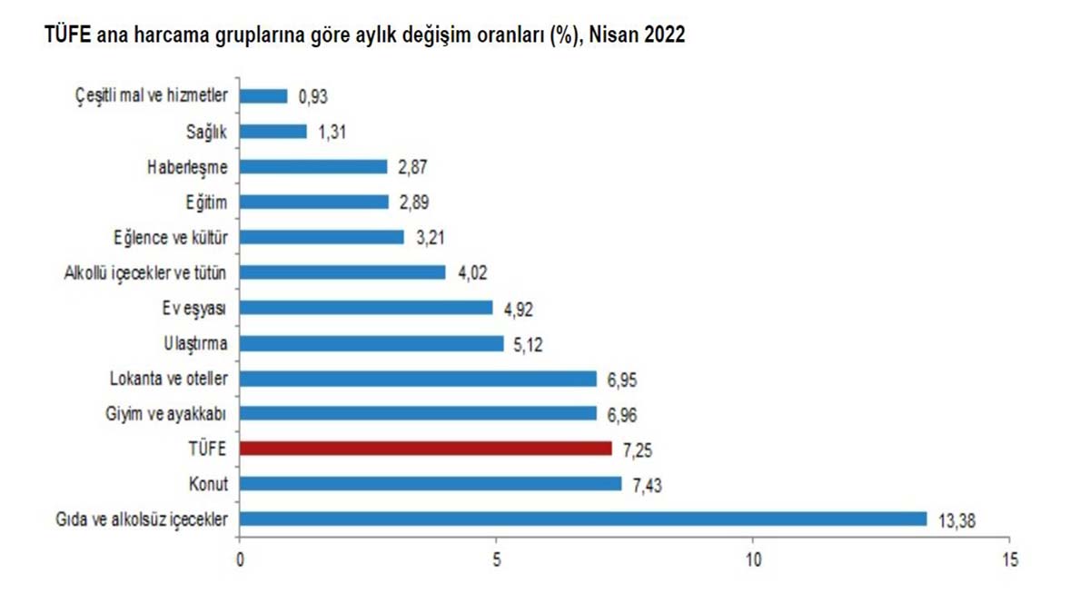 Türkiye İstatistik Kurumu verilerine göre; TÜFE’de 2022 Nisan ayında önceki aya göre yüzde 7,25, önceki yılın Aralık ayına göre yüzde 31,71, önceki yılın aynı ayına göre yüzde 69,97 ve 12 aylık ortalamalara göre yüzde 34,46 artış oldu.