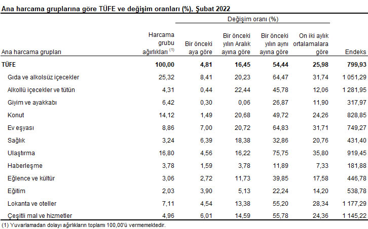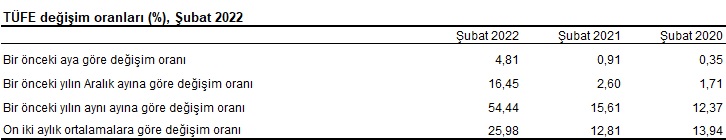 TÜFE’de (2003=100) 2022 yılı Şubat ayında bir önceki aya göre %4,81, bir önceki yılın Aralık ayına göre %16,45, bir önceki yılın aynı ayına göre %54,44 ve on iki aylık ortalamalara göre %25,98 artış gerçekleşti.