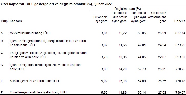 İşlenmemiş gıda ürünleri, enerji, alkollü içkiler ve tütün ile altın hariç TÜFE’de 2022 yılı Şubat ayında bir önceki aya göre %3,87, bir önceki yılın Aralık ayına göre %11,65, bir önceki yılın aynı ayına göre %47,01 ve on iki aylık ortalamalara göre %24,54 artış gerçekleşti.