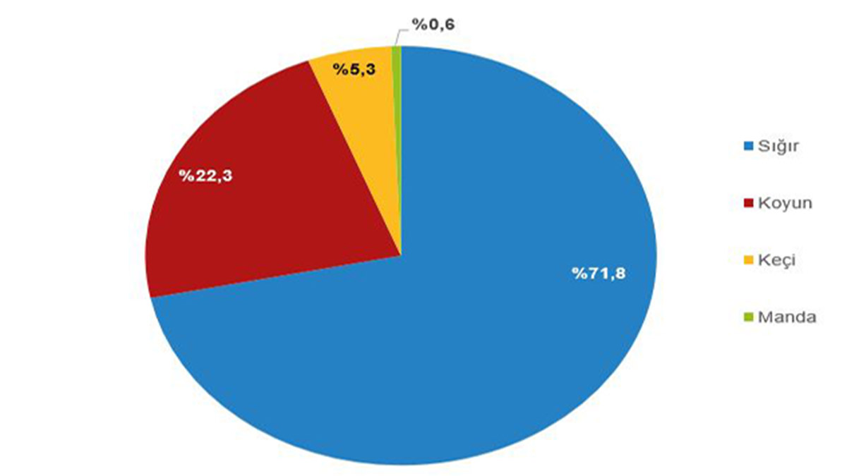 Son 10 yıla ilişkin kırmızı et üretim tahminleri incelendiğinde; toplam kırmızı et üretiminin 2013 yılında 1 milyon 99 bin 81 ton iken 2022 yılında 2 milyon 191 bin 625 tona ulaştığı görüldü. Kırmızı et üretiminin 2022 yılında yüzde 71,8’ini sığır eti, yüzde 22,3’ünü koyun eti, yüzde 5,3’ünü keçi eti ve yüzde 0,6’sını manda eti oluşturdu.