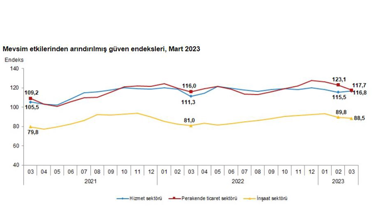Türkiye İstatistik Kurumu (TÜİK), 2023 Mart ayı güven endeksi oranlarını açıkladı; güven endeksinin hizmet sektöründe yükseldiğini, perakende ticaret ve inşaat sektörlerinde ise düştüğünü duyurdu.