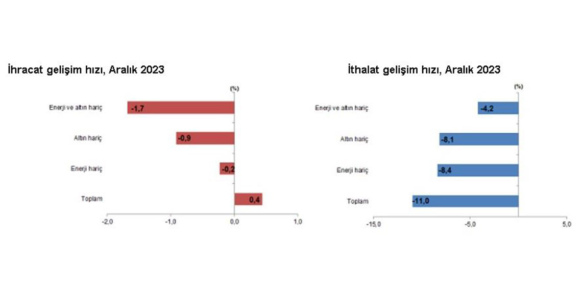 TÜİK, Aralık 2023 dönemine ilişkin dış ticaret istatistiklerini açıkladı. Buna göre; ihracat 2023 yılı aralık ayında, bir önceki yılın aynı ayına göre yüzde 0,4 artarak 23 milyar dolar, ithalat yüzde 11 azalarak 29 milyar 39 milyon dolar olarak gerçekleşti. İhracat 2023 yılı Ocak-Aralık döneminde bir önceki yılın aynı dönemine göre yüzde 0,6 artarak 255 milyar 777 milyon dolar, ithalat yüzde 0,5 azalarak 361 milyar 774 milyon dolar olarak gerçekleşti.