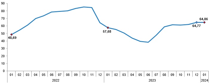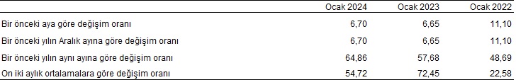 TÜFE’deki (2003=100) değişim 2024 yılı Ocak ayında bir önceki aya göre %6,70, bir önceki yılın Aralık ayına göre %6,70, bir önceki yılın aynı ayına göre %64,86 ve on iki aylık ortalamalara göre %54,72 olarak gerçekleşti.