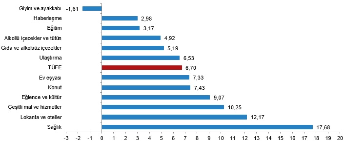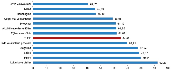 Bir önceki yılın aynı ayına göre en az artış gösteren ana grup %40,62 ile giyim ve ayakkabı oldu. Buna karşılık, bir önceki yılın aynı ayına göre artışın en yüksek olduğu ana grup ise %92,27 ile lokanta ve oteller oldu.