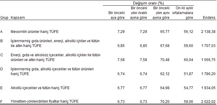 İşlenmemiş gıda ürünleri, enerji, alkollü içkiler ve tütün ile altın hariç TÜFE’deki değişim, 2024 yılı Ocak ayında bir önceki aya göre %6,85, bir önceki yılın Aralık ayına göre %6,85, bir önceki yılın aynı ayına göre %67,68 ve on iki aylık ortalamalara göre %59,60 olarak gerçekleşti.