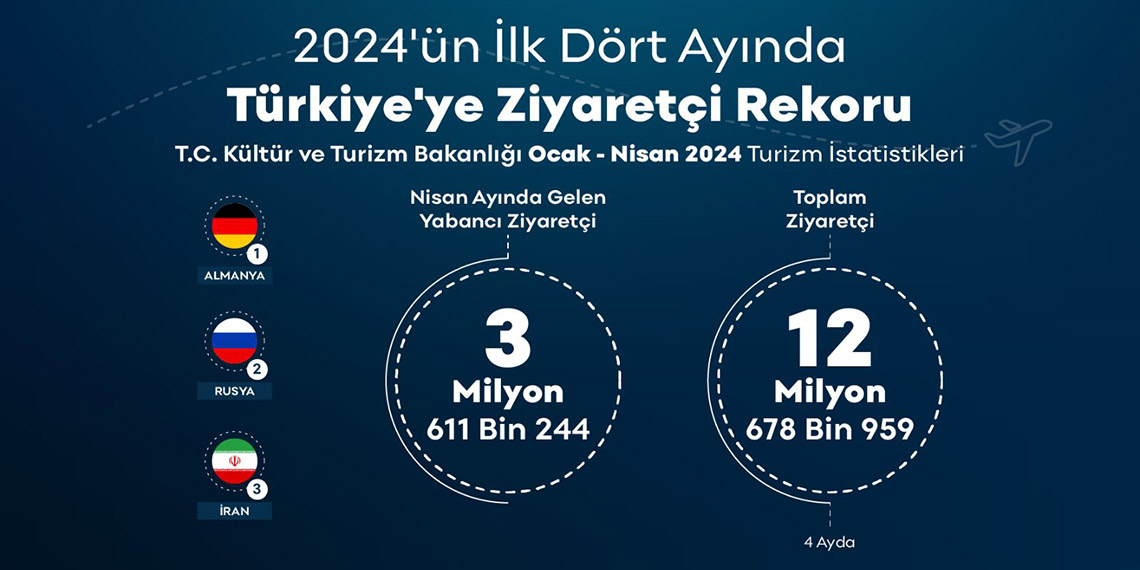 2024’ün ilk 4 aylık döneminde Türkiye’ye en çok ziyaretçi gönderen ülkeler sıralamasında Almanya, yüzde 16,20 artış ve 1 milyon 122 bin 930 ziyaretçi ile 1’nci sırada yer aldı. Rusya Federasyonu 1 milyon 78 bin 294 ziyaretçi ile 2’nci, İran yüzde 51,78 artış ve 946 bin 437 ziyaretçi ile 3’üncü oldu. Bu ülkeleri Bulgaristan ve İngiltere izledi. Türkiye’ye nisan ayında gelen yabancı ziyaretçi sayısı, geçen yılın aynı ayına göre yüzde 8,71 artarak 3 milyon 611 bin 244’e ulaştı. Nisan’da Türkiye’ye en çok ziyaretçi gönderen ülkeler sıralamasında Almanya 434 bin 863 kişi ile 1’inci, Rusya Federasyonu yüzde 4,07 artış ve 396 bin 155 kişi ile 2’nci, İngiltere yüzde 18,01 artış ve 330 bin 112 kişi ile 3’üncü oldu. Bu ülkeleri Bulgaristan ve İran takip etti. Türkiye turizminin 2024 yılında da başarı grafiğini yukarıya taşıyarak büyümesini sürdürdüğü belirtildi.