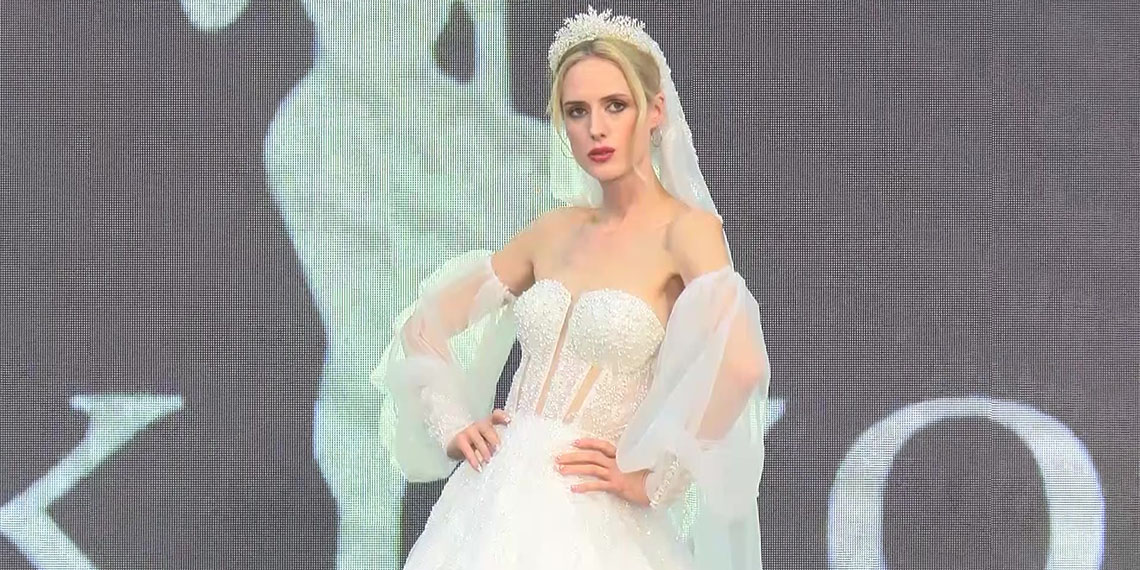 İstanbul gelinlik fuarında 8 ayda dikilen 30 kilogram ağırlığındaki gelinlik 1 milyon dolara satışa çıkarıldı.
