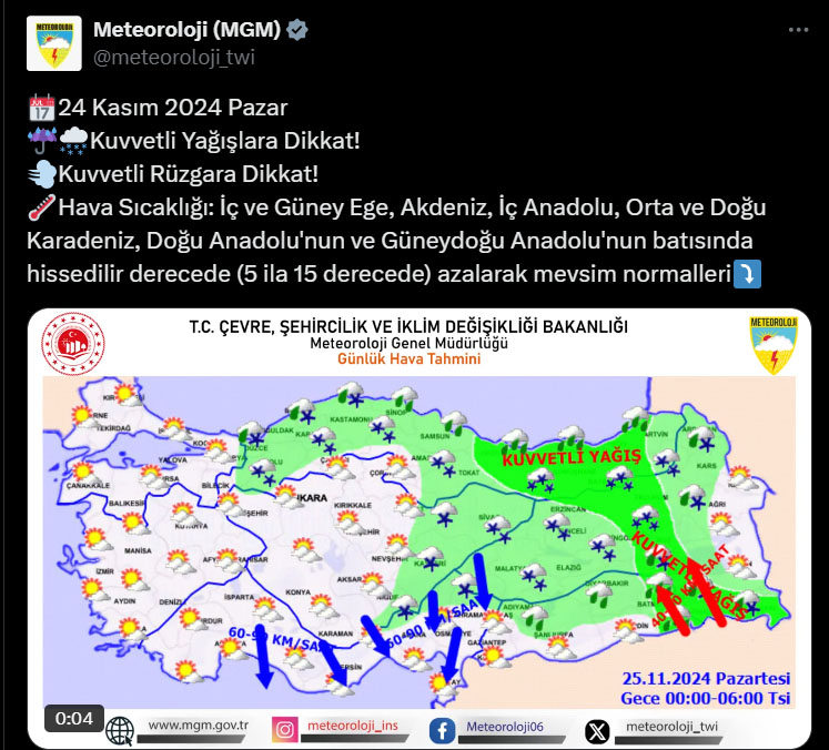 Bugün ülke genelinde bazı illerde kar yağışı ve sağanak yağış bekleniyor. Hava sıcaklıkları ise mevsim normallerinin 5 ila 15 derece altında seyredecek.