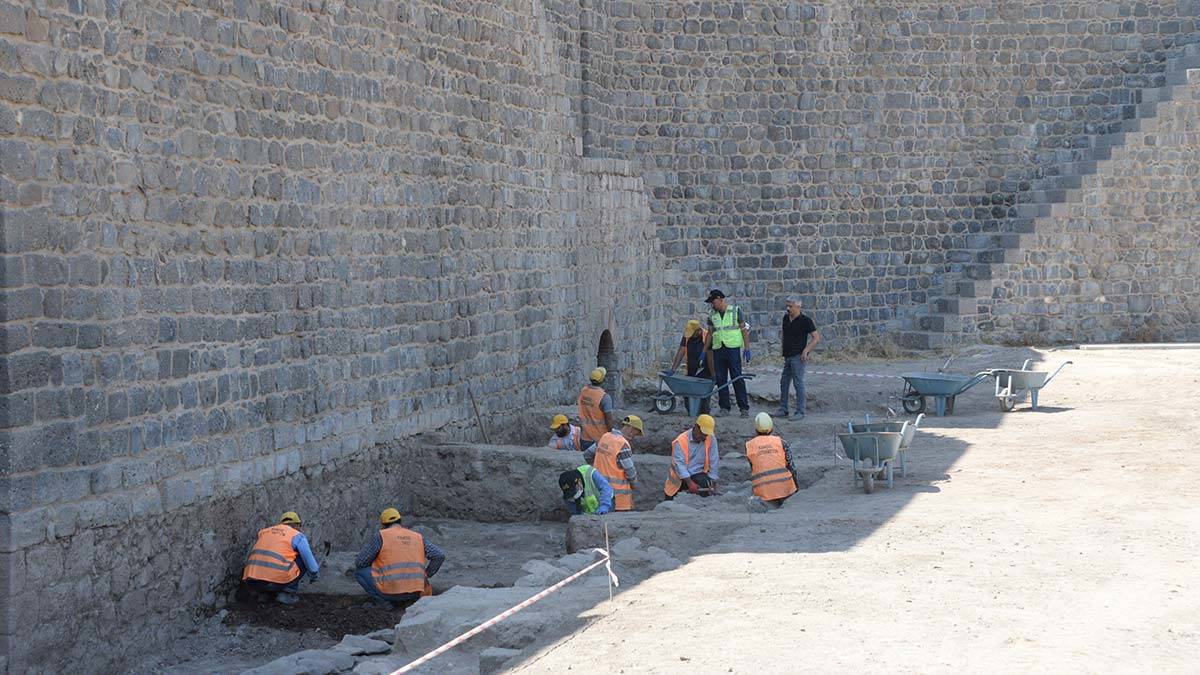 Şimdiye kadar yaklaşık 110 metre uzunluğunda, yer yer 3 metre, bazı yerlerde 8 metre genişliğinde surların dibindeki toprak dolgu alındığını aktaran Prof. Dr. Yıldız, “Yaklaşık 2,5 metre dolgu vardı, hemen hemen hepsi alındı. Çok az bir kısmı kaldı dolgu toprağın. Kazı çalışmaları bittikten ve surların dibi tam olarak açıldıktan sonra bu defa surların temel kısmına yönelik araştırma çalışmalarımız olacak.