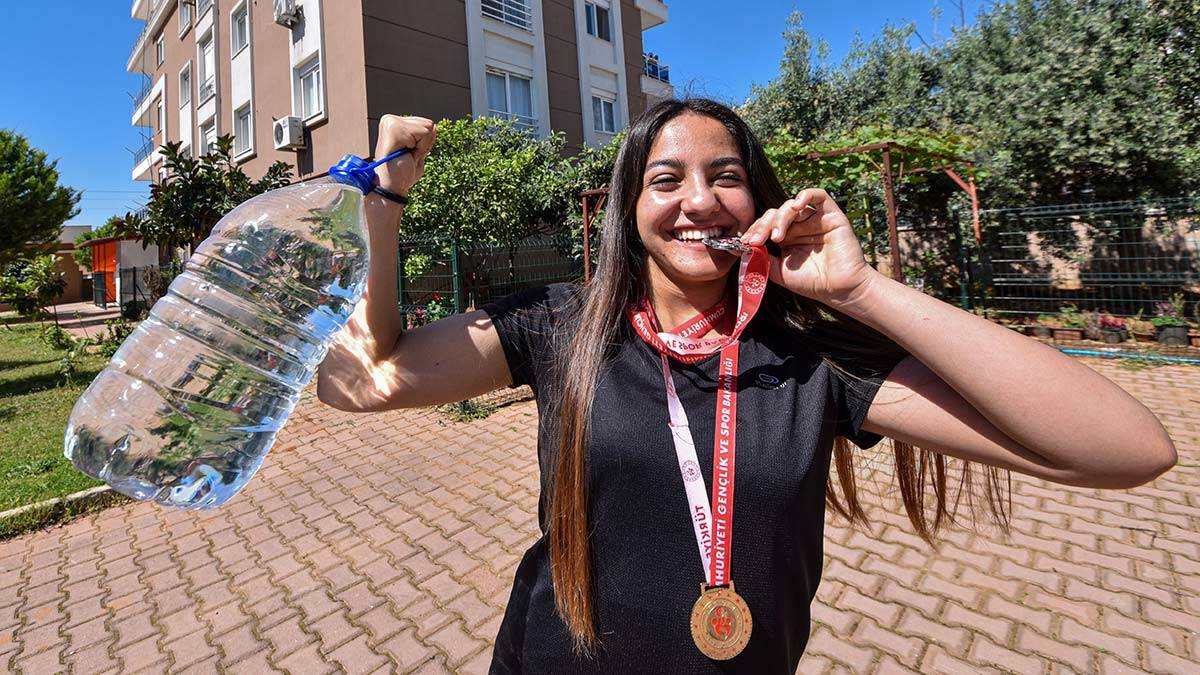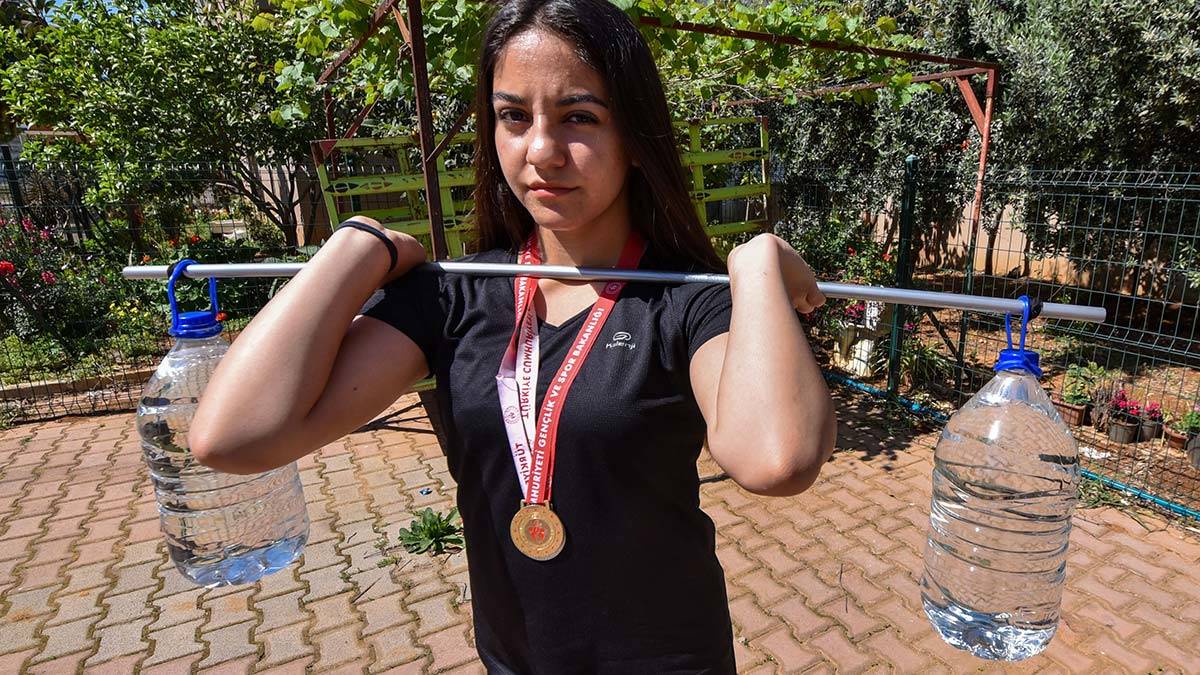 Antalya’da koronavirüs nedeniyle turnuvalar iptal olduktan sonra kısıtlamadan dolayı evinin bahçesinde 5 litrelik plastik su bidonlarını demir çubuğa takıp kaldırarak halter antrenmanı yapan Canan Canpolat (16), katıldığı ilk şampiyonada bronz madalya kazandı.
