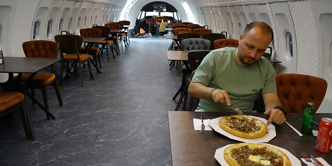 Trabzon Havalimanı’nda 5 yıl önce iniş sırasında kontrolden çıkıp, denize 25 metre kala yamaca saplanıp, hurdaya ayrılan Boeing 737-800 tipi yolcu uçağı, götürüldüğü Yomra sahilinde pide salonuna dönüştürüldü. 2 pilotu hakkında açılan davanın sürdüğü uçakta korku dolu anları yaşayan yolcular bir araya geldi, hizmete giren ‘uçak pide salonu’nun ilk davetlileri oldu. Yolcular, kaza sırasında koltuklarının yer aldığı alana konulan masada oturup, pide yedi.