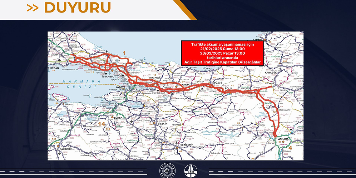 Pazar günü öğle saatlerine kadar devam etmesi beklenen hava şartları nedeniyle kritik yol kesimlerindeki trafik akışında olumsuzlukların yaşanmaması için 21 Şubat Cuma günü (bugün) saat 13.00’ten 23 Şubat Pazar günü saat 13.00’e kadar 2 gün boyunca; kamyon, çekici ve tanker cinsi ağır taşıtların (tedarik sürecinde aksama yaşanmaması gereken araçlar hariç) İstanbul, Kocaeli, Sakarya, Düzce, Bolu ve Ankara illerini kapsayacak şekilde D-100 ve D-750 Devlet Yolları ile TEM ve Kuzey Marmara otoyollarını kullanmalarına izin verilmeyecektir. Bu süreçte sürücülerin trafik işaret ve işaretçilerine uymaları, alternatif güzergahları tercih etmeleri önem taşımaktadır” denildi.