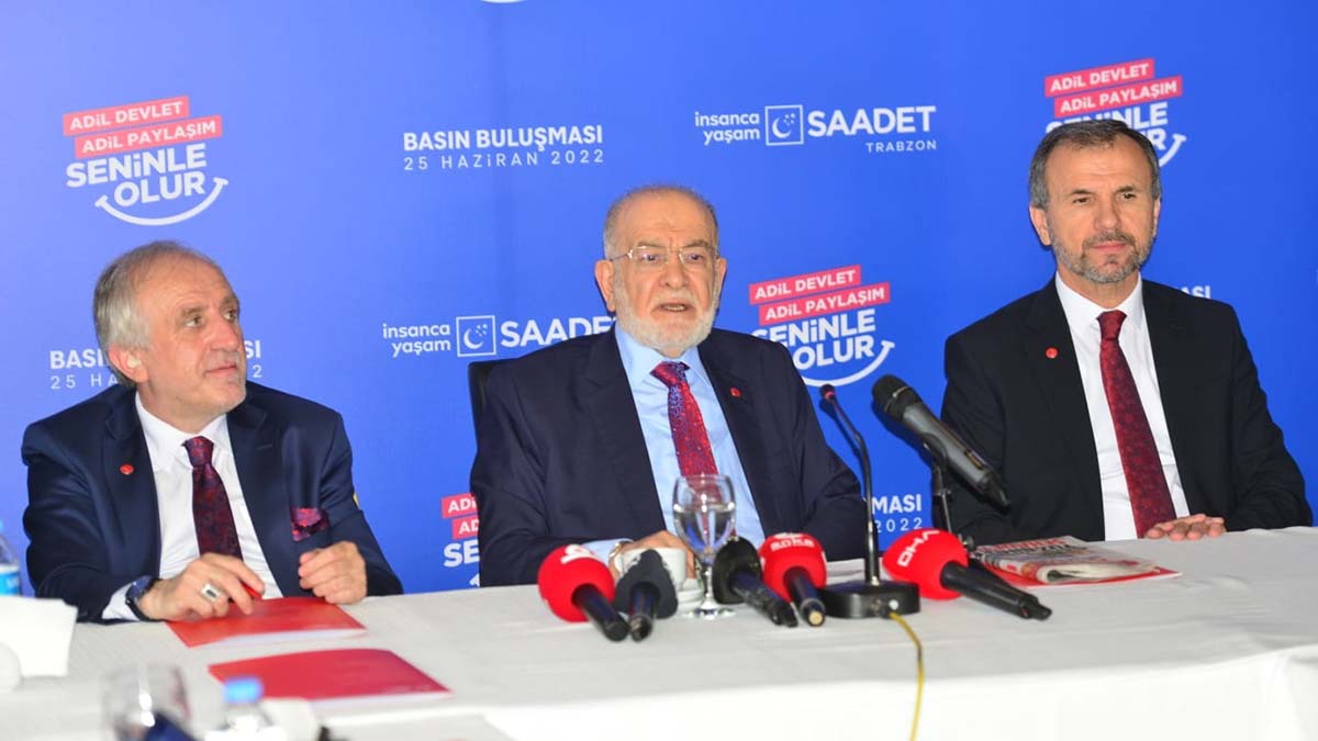 SP lideri Karamollaoğlu, programları kapsamında dün akşam Trabzon’a geldi. Geceyi burada geçiren Karamollaoğlu, Kaşüstü Mahallesi’nde konakladığı otelde düzenlediği basın toplantısında açıklamalarda bulundu. Sözlerine Süper Lig ekiplerinden Trabzonspor’u şampiyonluğu nedeniyle kutlayarak başlayan Karamollaoğlu, Seçim Kanunu değişikliğine tepki gösterip, esas meselelerinin, ülkenin içinde bulunduğu şartlar olduğunu söyledi.