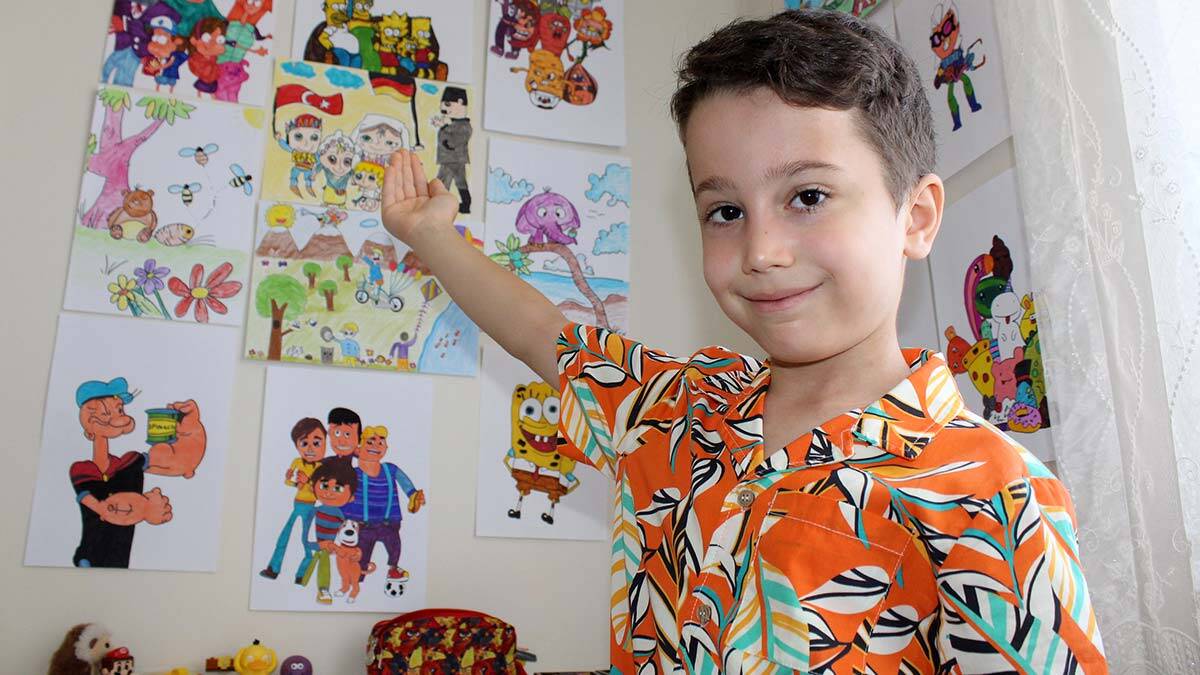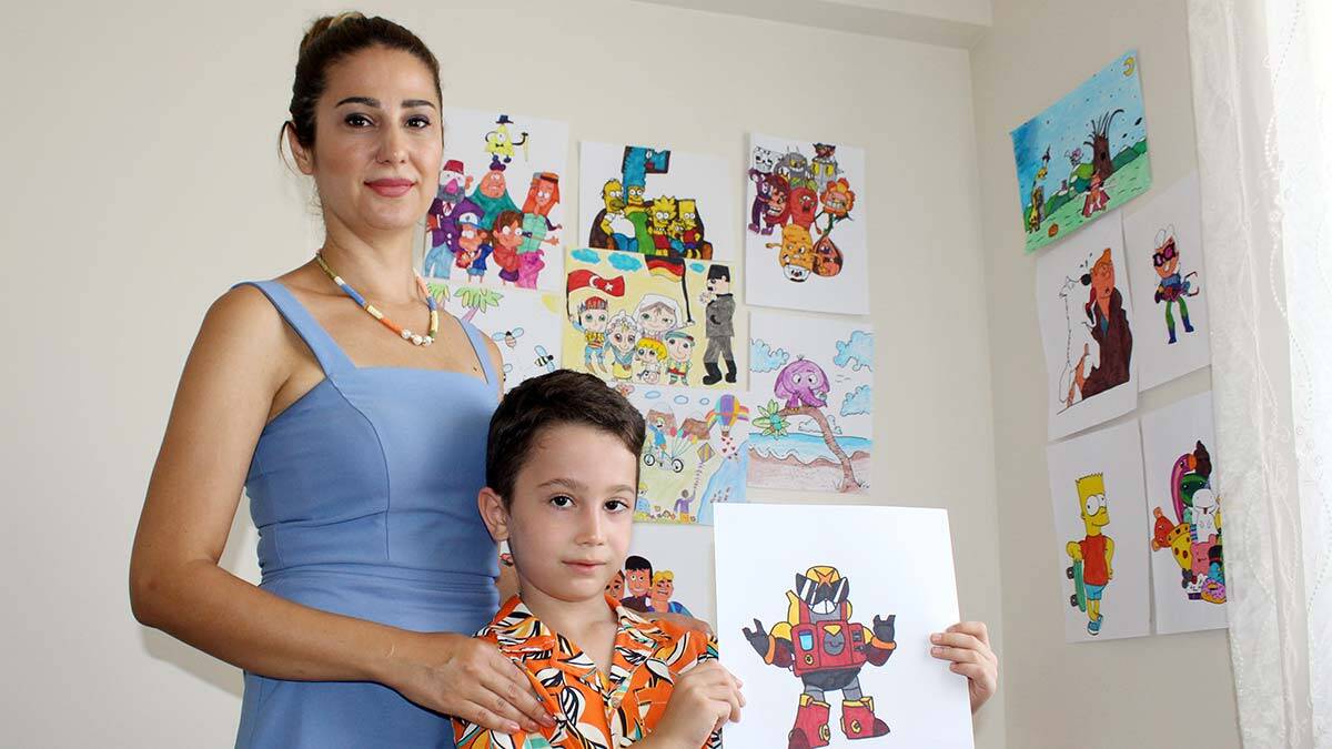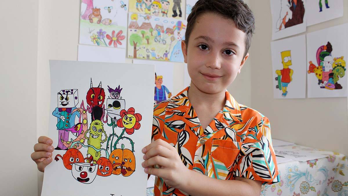 Yaz tatili için Antalya’ya gelen Tuna Özışıklı, çizim yapmaya 3 yaşında başladığını anlattı. Tuna Özışıklı, “Resim yapmayı çok seviyorum. İlk olarak zombi çizmeye başladım. İzlediğimde biraz korktum ama sonra etkilendim, ben de onu çizmek istedim. Çizim yaptıkça alışmaya başladım. Çevremdekiler yaptığım karikatürleri beğendi” dedi.