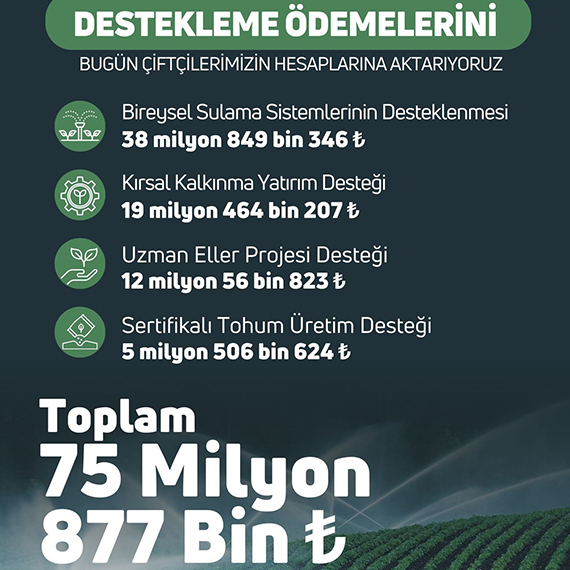 Bakan Yumaklı, sosyal medya hesabından yaptığı açıklamada, “Bireysel sulama, kırsal kalkınma, uzman eller, sertifikalı tohum üretimi projelerimiz kapsamında 75 milyon 877 bin TL tarımsal destekleme ödemesini bugün çiftçilerimizin hesaplarına aktarıyoruz. Üreticilerimize hayırlı ve bereketli olsun” dedi.