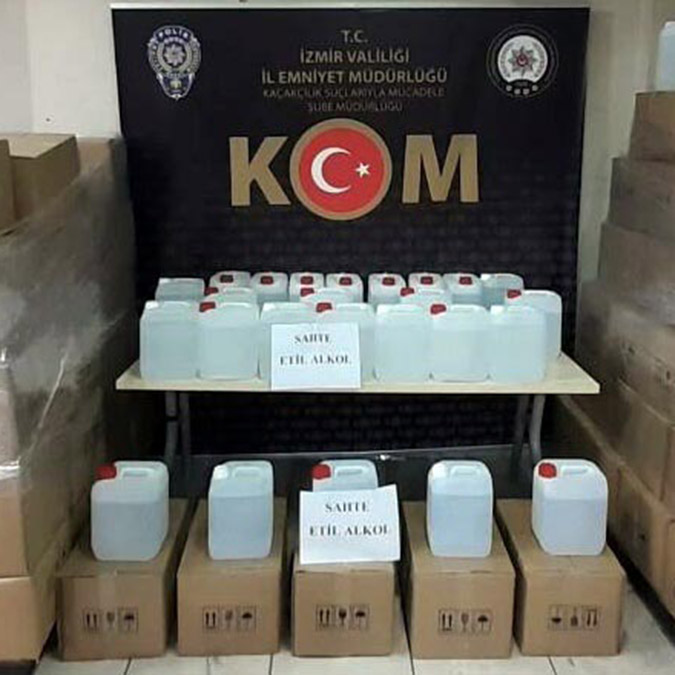 İzmir’de, polis tarafından yapılan operasyonlarda 8 ton sahte etil alkol ele geçirildi, 9 şüpheli gözaltına alındı.