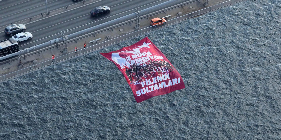 Filenin Sultanları’nın ‘2 Kupa 1 Şampiyon’ yazılı bayrağı, 15 Temmuz Şehitler Köprüsü, Fatih Sultan Mehmet Köprüsü ve Yavuz Sultan Selim Köprüsü’nde dalgalanıyor.