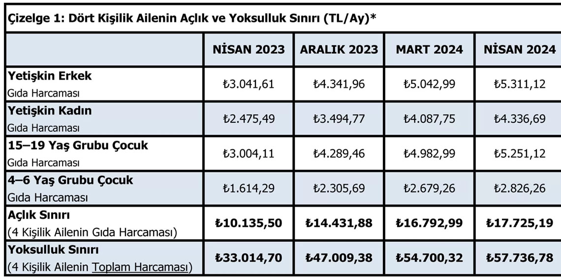 Ankara’da yaşayan dört kişilik bir ailenin sağlıklı, dengeli ve yeterli beslenebilmesi için yapması gereken aylık gıda harcaması tutarı (açlık sınırı) 17.725,19 TL, Gıda harcaması ile giyim, konut (kira, elektrik, su, yakıt), ulaşım, eğitim, sağlık ve benzeri ihtiyaçlar için yapılması zorunlu diğer aylık harcamalarının toplam tutarı ise (yoksulluk sınırı) 57.736,78 TL oldu.