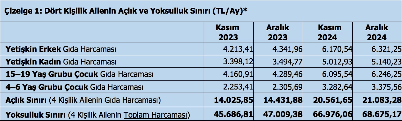 - Ankara’da yaşayan dört kişilik bir ailenin sağlıklı, dengeli ve yeterli beslenebilmesi için yapılması gereken aylık gıda harcaması tutarı (açlık sınırı) 21.083,28 TL’ye,
