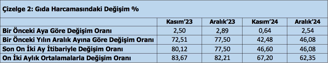 TÜRK-İŞ’ in verilerine göre “mutfak enflasyonu” verilerindeki değişim Aralık 2024 itibariyle şu şekilde gerçekleşmiştir: