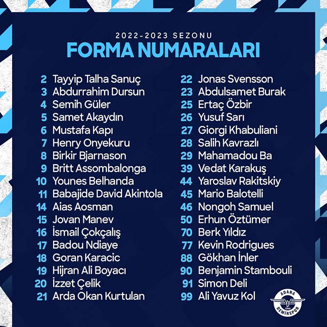Süper Lig ekiplerinden Adana Demirspor’da forma numaraları belli oldu. Mario Balotelli’nin yeni sezonda 45 numaralı formayı giyeceği duyuruldu.