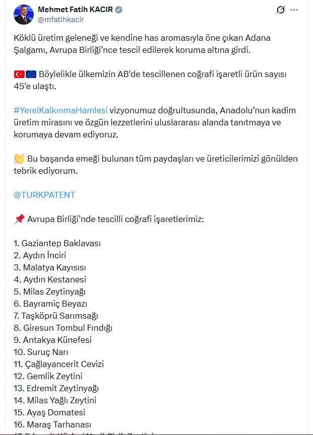 Bakan Kacır, sanal medya hesabından yaptığı paylaşımda, yerel kalkınma hamlesi vizyonu doğrultusunda, Anadolu’nun kadim üretim mirasını ve özgün lezzetlerini uluslararası alanda tanıtmaya ve korumaya devam ettiklerini vurguladı. Kacır, “Köklü üretim geleneği ve kendine has aromasıyla öne çıkan Adana şalgamı, Avrupa Birliği’nce tescil edilerek koruma altına girdi. Böylelikle ülkemizin AB’de tescillenen coğrafi işaretli ürün sayısı 45’e ulaştı. Yerel kalkınma hamlesi vizyonumuz doğrultusunda, Anadolu’nun kadim üretim mirasını ve özgün lezzetlerini uluslararası alanda tanıtmaya ve korumaya devam ediyoruz. Bu başarıda emeği bulunan tüm paydaşları ve üreticilerimizi gönülden tebrik ediyorum” ifadelerini kullandı.