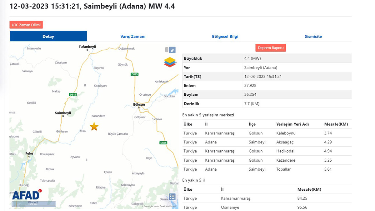 T.C. İçişleri Bakanlığı Afet ve Acil Durum Yönetimi Başkanlığı (AFAD), Adana’nın Saimbeyli ilçesinde saat 15.31’de, 4.4 büyüklüğünde deprem meydana geldiğini duyurdu.