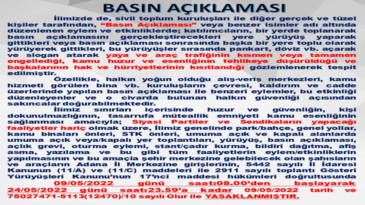 İlimiz sınırları içerisinde huzur ve güvenliğin, kişi dokunulmazlığının, tasarrufa müteallik emniyeti kamu esenliğinin sağlanması amacıyla; siyasi partiler ve sendikaların yapacağı faaliyetler hariç olmak üzere, ilimiz genelinde park/bahçe, genel yollar, kamu binaları önleri, STK önleri, umuma açık ve kapalı alanlarda umuma açık veya/kapalı yer toplantıları, yürüyüş, basın açıklaması, açlık grevi, oturma eylemi, stant/çadır kurma, bildiri dağıtma, afiş asma, yazılama ve bu gibi tüm faaliyetlerin eylem/etkinliklerin yapılmasının ve bu amaçla şehir merkezine gelebilecek olan şahısların ve araçların Adana il merkezine girişlerinin, 5442 sayılı İl İdaresi Kanunun (11/A) ve (11/C) maddeleri ile 2911 sayılı toplantı Gösteri Yürüyüşleri Kanunu’nun 17’nci maddesi hükümleri doğrultusunda 09/05/2022 günü saat: 08.00’den başlayarak 24/05/2022 günü saat:23.59’a kadar 09/05/2022 tarih ve 75027471-5113(12470)/10 sayılı olur ile yasaklanmıştır.’’