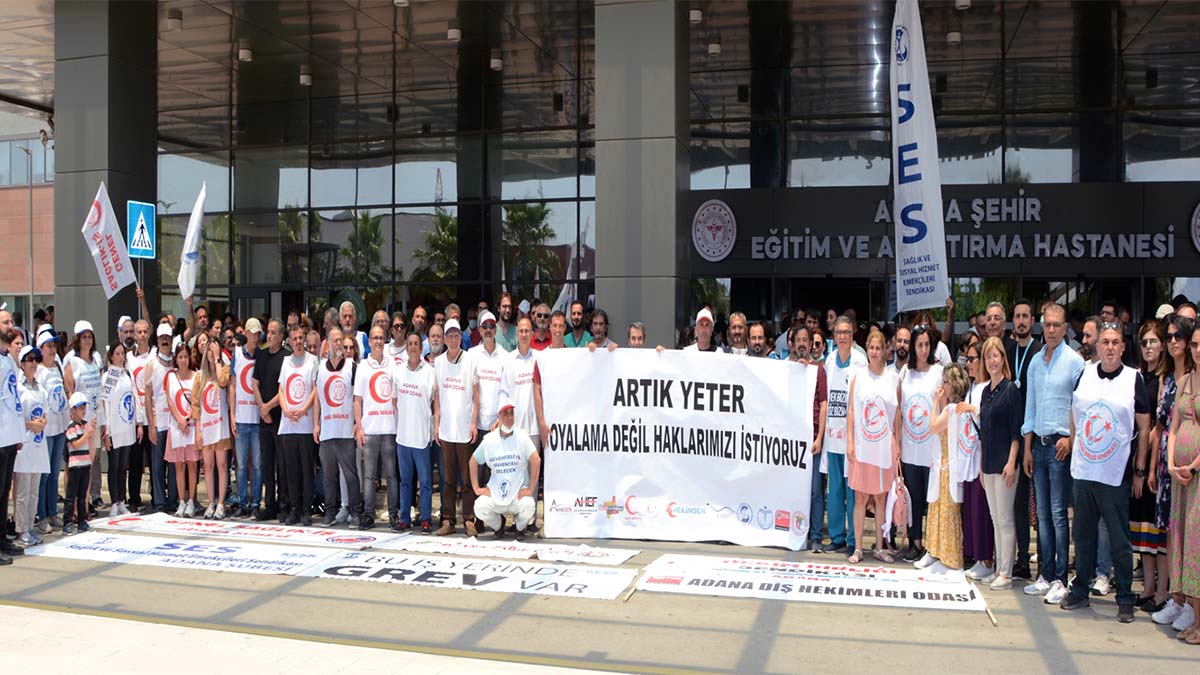 Adana’da, taleplerinin yerine getirilmesi amacıyla doktorlardan iş bırakma eylemi yapıldı. Adana Tabip Odası öncülüğünde Adana Şehir Hastanesi Eğitim ve Araştırma Hastanesi Başhekimliği önünde toplanan hekimlere, sağlık sendikaları başta olmak üzere çeşitli sendika üyeleri de destek verdi.