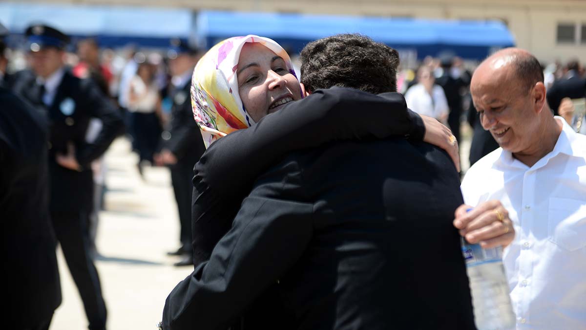 Öte yandan kentte 36 dereceyi bulan hava sıcaklığından bazı polis adayları etkilendi. Meslektaşları, rahatsızlanan polis adaylarını gölgeye taşırken, törende de su molası verildi. Konuşmaların ardından silah başına gelen öğrenciler, meslek yeminlerini edip kep attı. Törenin ardından polis adayları, mutluluklarını birbirlerine ve ailelerine sarılarak paylaştı.