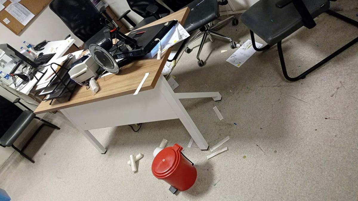 Şüphelilerden biri masanın üzerindeki kullanılmış iğne uçlarının biriktirildiği tıbbi atık kutusunu Arpacı’ya fırlatırken, diğeri ise önündeki masayı tekmeleyerek kolundan yaralanmasına neden oldu.