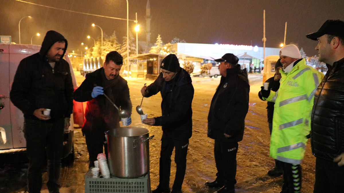 Belediye Başkan Yardımcısı Öztopbaş da “Yaklaşık 2 saat süren kar yağışından sonra yollarımız kapandı. Biz de yolda kalan vatandaşlarımıza çorba ikramında bulunmak için zabıta ekiplerimizle otogarın önüne geldik. Kamyoncu arkadaşlarımıza, yolda kalan arkadaşlarımıza çorba ikramında bulunduk” diye konuştu.