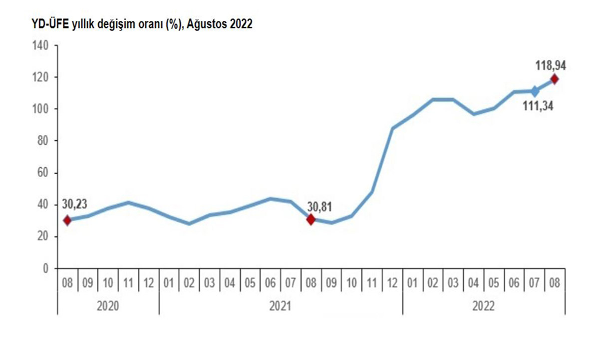 TÜİK’ten yapılan açıklamaya göre; YD- ÜFE, Ağustos 2022’de geçen aya göre yüzde 2,64, geçen yılın aralık ayına göre yüzde 39,79, geçen yılın ağustos ayına göre yüzde 118,94 ve 12 aylık ortalamalara göre yüzde 88,82 arttı. Sanayinin 2 sektörünün YD-ÜFE bazında yıllık değişimlerinde; madencilik ve taş ocakçılığında yüzde 116,48, imalatta yüzde 118,98 artış kaydedildi.
