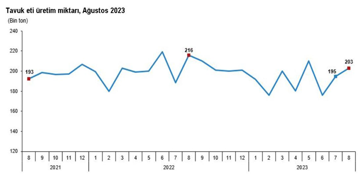 TÜİK, Ağustos 2023 dönemine ilişkin kümes hayvancılığı ile süt ve süt ürünleri üretimlerine ilişkin verileri açıkladı. Buna göre; ağustos ayında bir önceki yılın aynı ayına göre tavuk yumurtası üretimi yüzde 4,5 artarken; tavuk eti üretimi yüzde 5,9, kesilen tavuk sayısı yüzde 7,7 ve hindi eti üretimi yüzde 29,1 azaldı. Ocak- ağustos döneminde bir önceki yılın aynı dönemine göre tavuk yumurtası üretimi yüzde 4,2 artarken; tavuk eti üretimi yüzde 4,6, kesilen tavuk sayısı yüzde 7,5 ve hindi eti üretimi yüzde 11,9 azaldı. Bir önceki ay 194 bin 912 ton olan tavuk eti üretimi ağustosta yüzde 4,2 artarak 203 bin 60 ton oldu. Bir önceki ay 1 milyar 683 milyon 199 bin adet olan tavuk yumurtası üretimi de ağustos ayında yüzde 4,6 artarak 1 milyar 759 milyon 864 bin adet oldu.