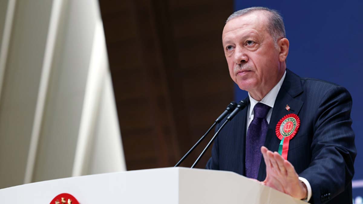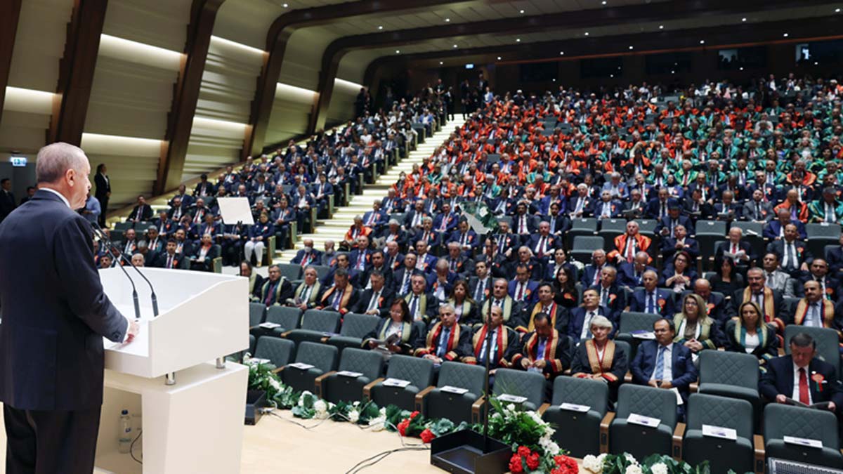 Burada konuşan Erdoğan, yeni adli yılın tüm adalet teşkilatına hayırlı olmasını dileyerek, “Türkiye, Anayasasında da belirtildiği şekilde, demokratik, laik, sosyal bir hukuk devletidir. İnsanlık tarihindeki mücadelelerin merkezinde hep bu arayış yer alıyor. Biz de geride bıraktığımız 20 yılda ülkemizin hukuk devleti vasfını güçlendirmek için önemli reformlara imza attık. Reformlarımızın en önemli unsurlarını insan hak ve hürriyetleri, kadın hakları, çocuk hakları, adalet sistemimizin geliştirilmesi gibi başlıklar oluşturmuştur. Esasen ülkemizdeki Anayasaların neredeyse tamamının olağanüstü dönemlerin ürünü olması eskiden beri dile getirdiğimiz bir sıkıntımızdır” dedi.