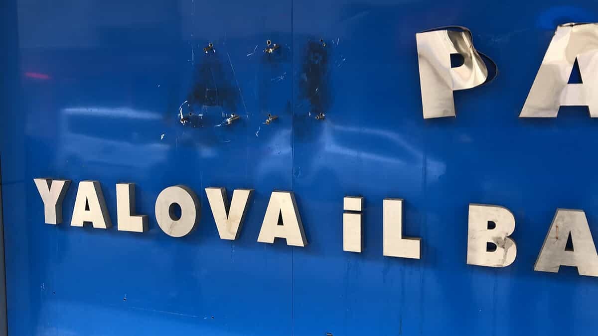 Yalova’da kimliği belirsiz bir kişi, AK Parti İl Başkanlığı binasına saldırarak, çekiçle tabela ve camları kırdı.