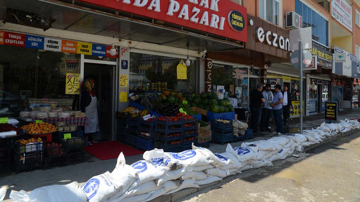 Ankara’nın selden etkilenen Akyurt ilçesinde esnaf, yeni su baskınına karşı önlem amaçlı iş yerlerinin önüne kum torbaları ile barikat kurarak önlem aldı.