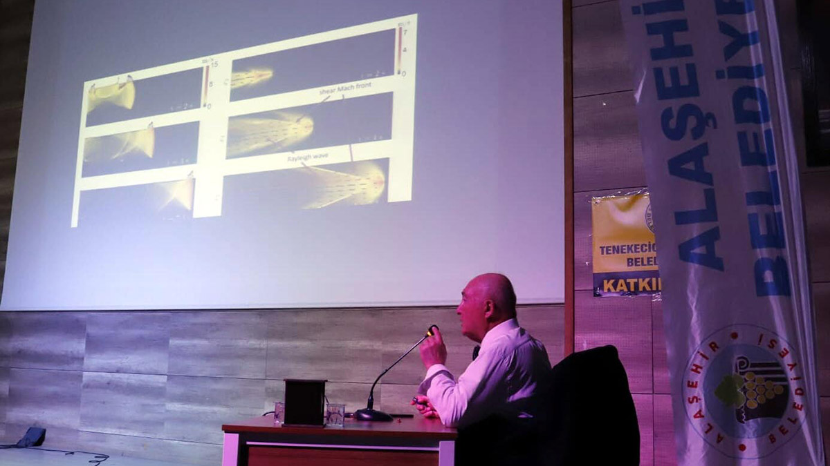 Konferansta konuşan Prof. Dr. Övgün Ahmet Ercan, Alaşehir’de yaptığı incelemelerde elde ettiği bilimsel verileri değerlendirdi. Alaşehir’in Pamukkale- Tepeköy Fayı ile Bozdağ istikametinden gelen bir fay hattının arasında sıkıştığını belirten Prof. Dr. Ercan, “Alaşehir’de 6.2 ile 7 büyüklüğünde bir deprem tahmin ediyoruz. Özellikle istasyon altı bölgeleri sıvılaşmış kaygan bir zeminden oluşuyor. Ayrıca bu alanlarda 60-80 santimetre arasında atılmış bazı temeller gördüm.
