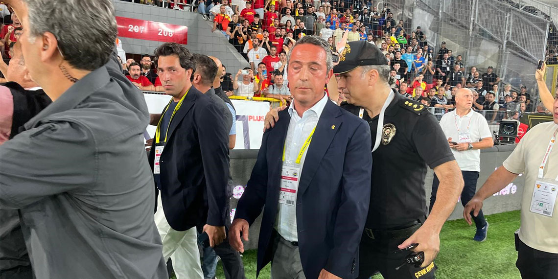 Başkan Koç, güvenlik ekipleriyle birlikte Göztepeli taraftarların olduğu güney kale arkası tribününde geçip Fenerbahçeli futbolseverlerin maçı izlediği alana girdi. Göztepeli taraftarların Koç’a yabancı maddeler attığı görüldü. Ali Koç ve Fenerbahçe yönetiminin, sarı-lacivertli taraftarların tribünde yaşadığı karışıklığa müdahale etmek için sahaya girdiği öğrenildi. Ardından tekrar tribünden çıkıp maçın oynandığı esnada tekrar güney kale arkasından geçen Ali Koç’a büyük tepki yağdı. Ali Koç, çıkış tüneline giderken arkadan itildi ve yere düşürüldü. Başkan Koç’un başına su şisesi geldiği gözlenirken maça ara verildi.