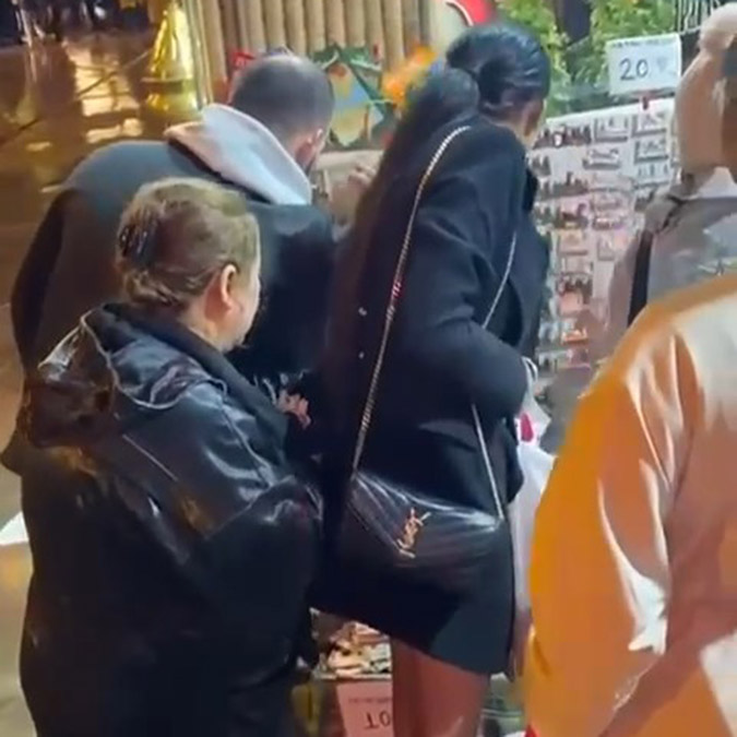 Sosyal medyaya yansıyan görüntülerde Beyoğlu’nda bir stantta alışveriş yapan kişilere yaklaşın kadına yaklaşan bir kadın cep telefonu çalıyordu.